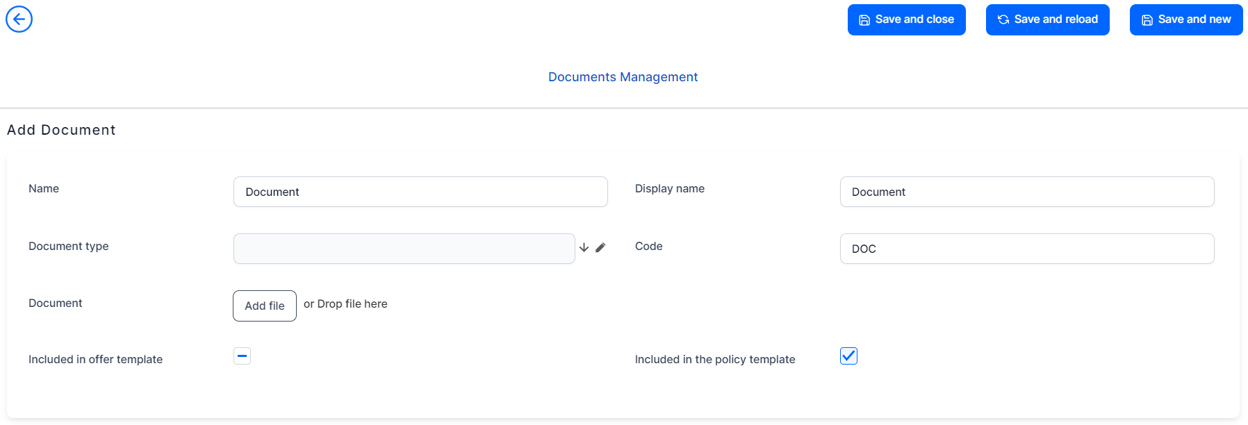 Document Type: From the drop-down, choose between Policy, Terms & Conditions or IPID - Insurance Product Information Document - which is a necessary type of document for the Quote & Buy journeys;
