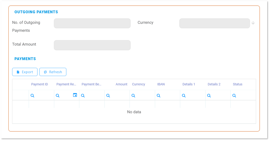 At the bottom of the section, you can see the Payments grid - containing every outgoing payment extracted from the imported file. For the case when there are many outgoing payments, you can use the search functionality, inside this grid, to find a certain outgoing payment.