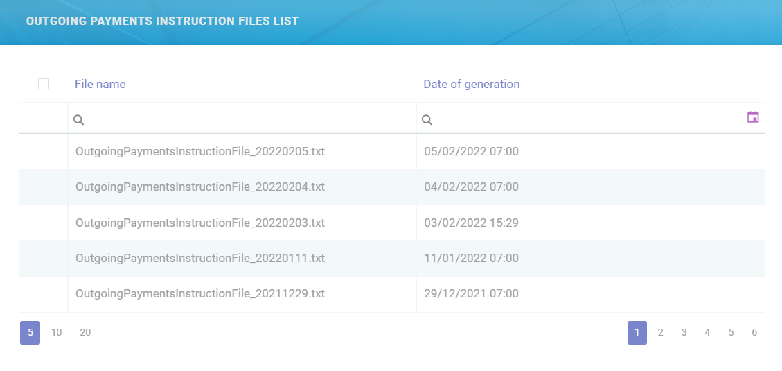 In your portal, the O(utgoing) P(ayments) I(nstruction) Files section offers you an overview of all the payment instruction files generated by the system, with the newest record registered at the top.