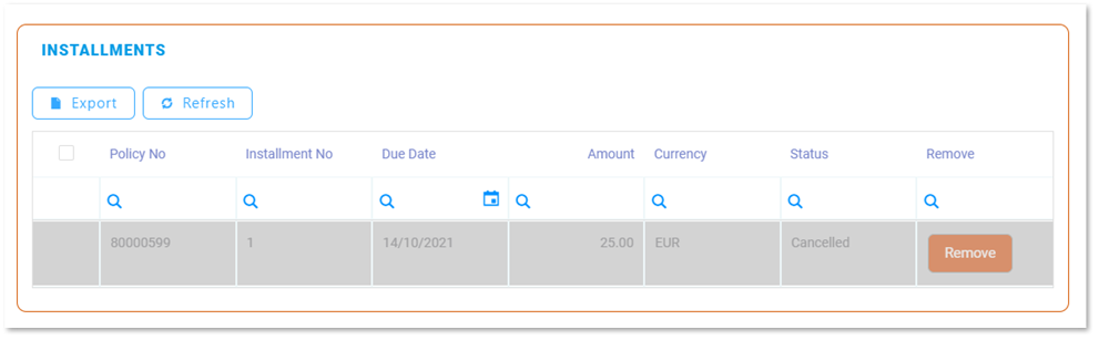 The Installments section contains details about all the installments registered on that invoice. And there can be one or more installments listed inside this grid - for example for the case when an invoice is generated for a group policy. For the same case (of many installments on the same invoice), you also can search inside this grid by different keywords - such as Policy No, Installment No, Due Date, or Status.