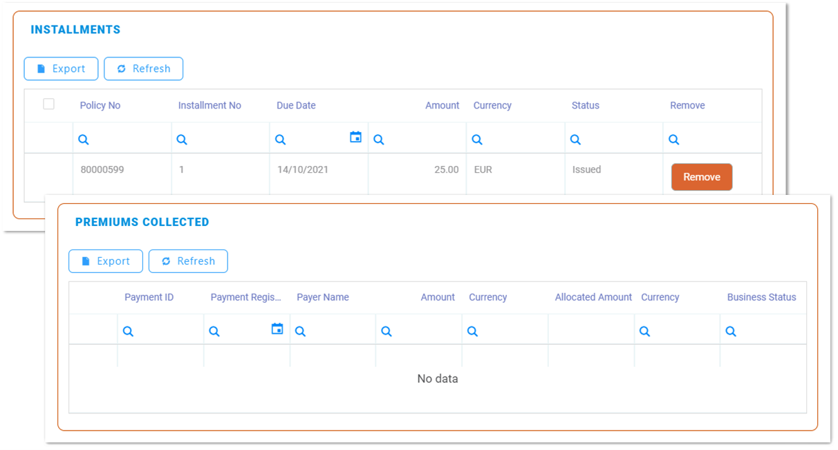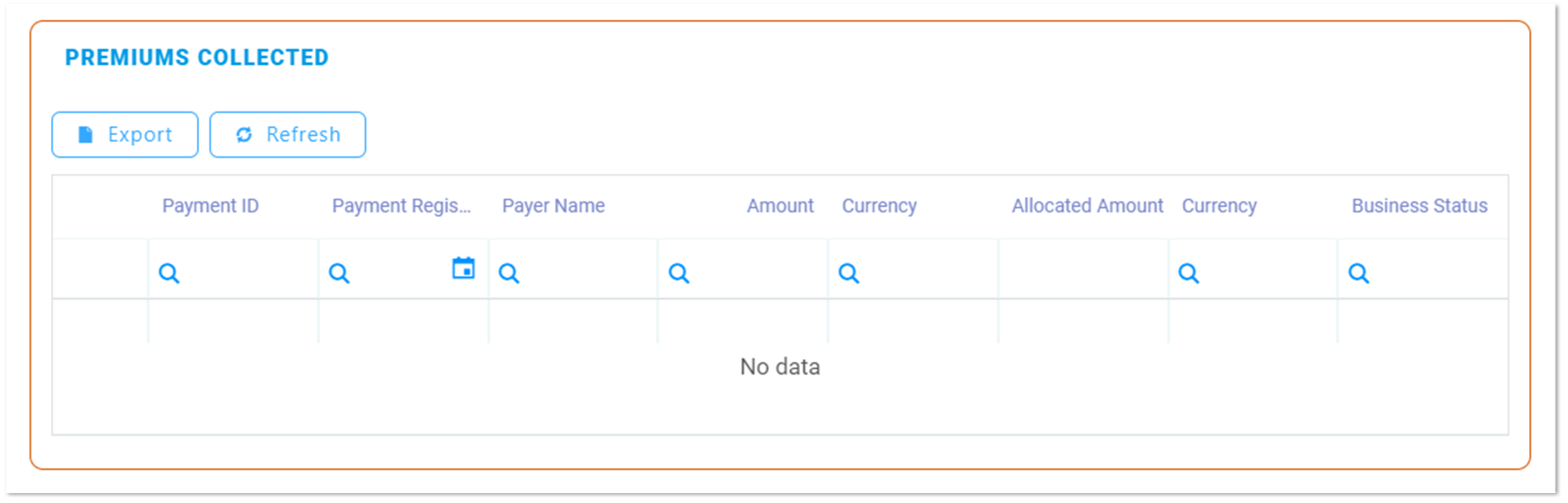 The Premiums Collected section contains details about all the premiums collected on that invoice. And there can be one or more premiums listed inside this grid - for example for the case when an invoice is generated for a group policy. For the same case, of many premiums paid on the same invoice, you also can search inside the grid by different keywords - such as Payment ID, Payment Registration Date, Payer Name or Business Status.