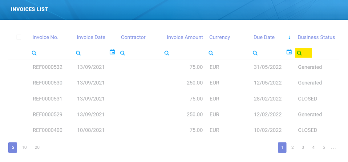 In your portal, in the Invoices section, you have an overview of the invoices generated into your system - with the newest invoice at the top. This is an all-inclusive view; yet, you also can search and sort your payments for easier processing. For example if you want to view all the invoices in Unpaid status, you can use the Search by Business Status option and sort all your invoices accordingly.