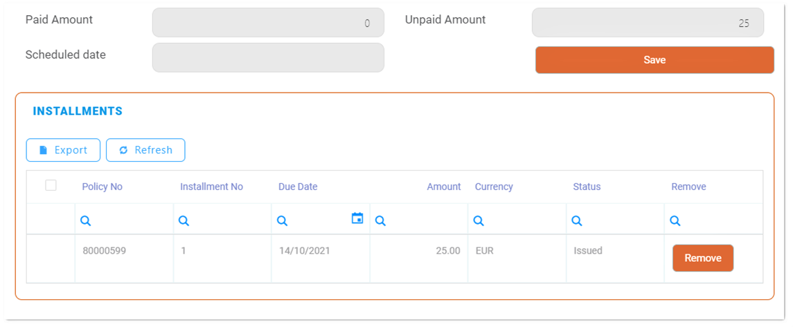 | Scheduled date | The date scheduled for paying the installment, set at the policy level. |
