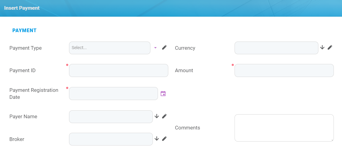 On the Payments List page, click Insert, at the top right corner of the page, to open the Insert Payment Form.
