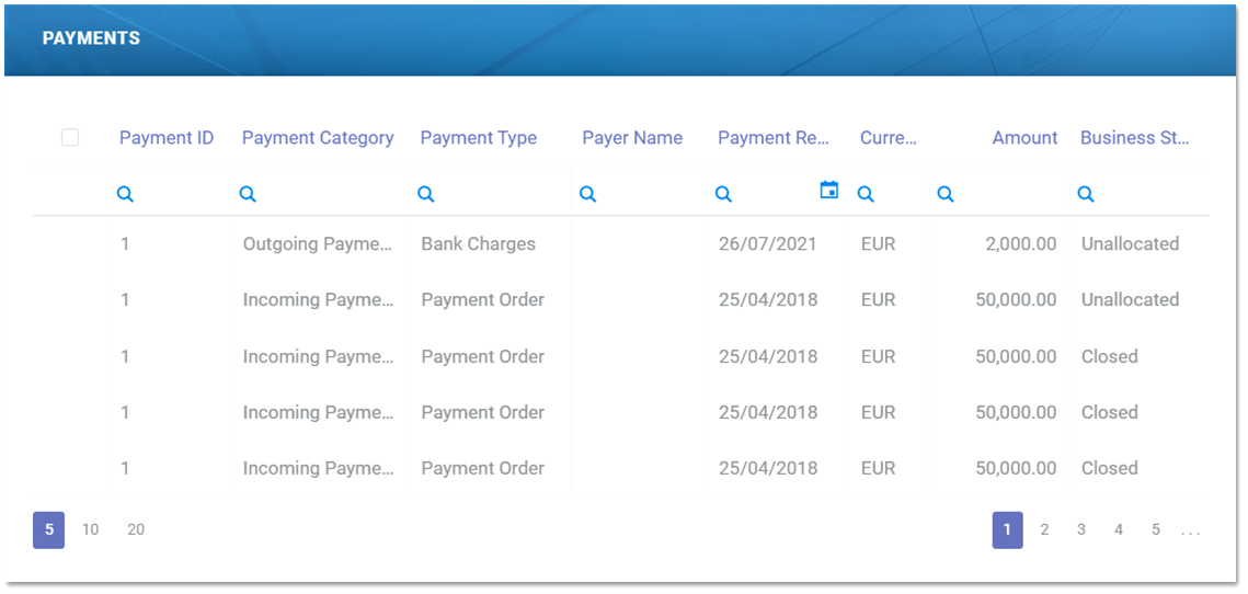 Double clicking on a payment record that is in Unallocated or Partially Allocated business status, opens the Unallocated Payments Form that lets you manually allocate, deallocate or return that payment. For example for an incoming payment you can allocate the sum on a specific installment (partially or entirely) and for an outgoing payment you can approve the proposed payment request (depending on security roles).