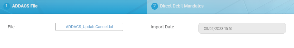 The ADDACS File tab - This first tab includes the actual File with the notification (or notifications) for the mandates existing in your system. The Import Date field is completed automatically.