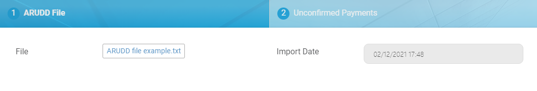 The first tab - includes the actual File with the unconfirmed payment for a specific mandate and the auto-populated Import Date field.