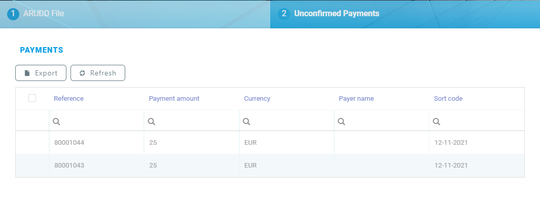 The ARUDD Unconfirmed Payments section contains details about all the unconfirmed direct debit payments, registered in the system.