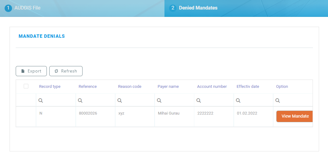 The second tab - includes a grid containing every denied mandate extracted from the imported file. For the case when there are many records listed, you also can search inside this grid by different keywords - such as Record type, Reference, Reason code, Payer name, Account number, Effective date, and Option.