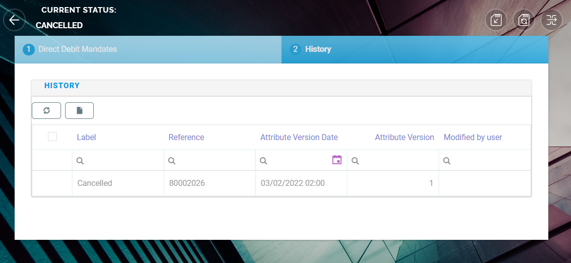 3. Once approved, the History tab opens and you can check the logging of the version you recently created on the selected direct debit mandate.