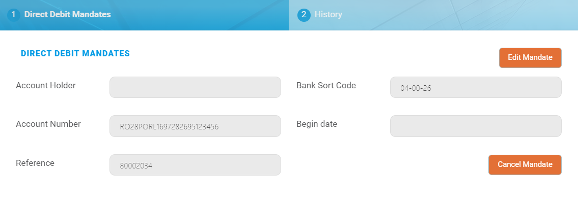 The UK Direct Debit Mandate Form allows you to inspect, edit or cancel a mandate. The form is organized as follows: