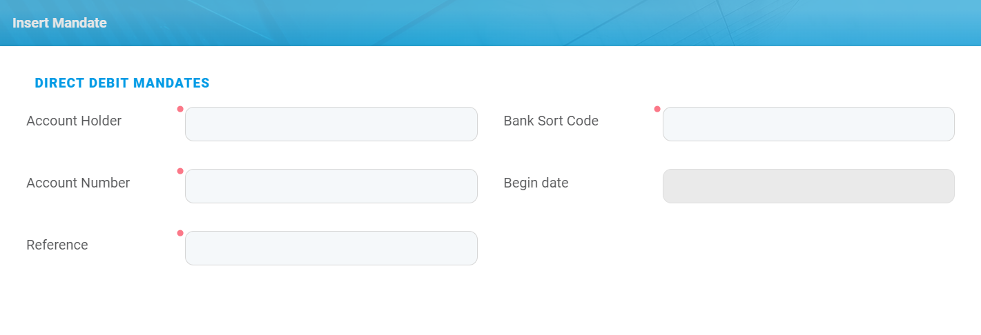 On the Direct Debit Mandates page, click Insert, at the top right corner of the page, to open the Insert Mandate Form.