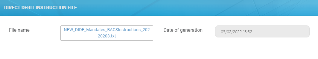 For the new direct debit mandate calls, received through the Generate UK Mandate API, there is a daily job - DIDEUK_Instructions, that is scheduled to generate mandate activation instructions for the BACS system, compliant with the BACS standardized .txt file format. This section holds all the files containing the instructions for the activation of direct debit mandates generated by Billing and Collection solution. This is where you go to check how many new mandates were activated.