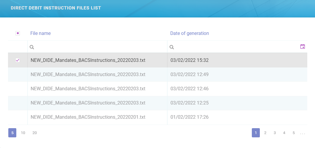 The Direct Debit Payment Instruction Files section hosts all your files containing the instructions for direct debit payments generated by the system. You can search inside this repository by File or Date of Generation. You can inspect a record by double-clicking it. If you want to inspect the details inside any Direct Debit Payment Instruction File, you must download the file.