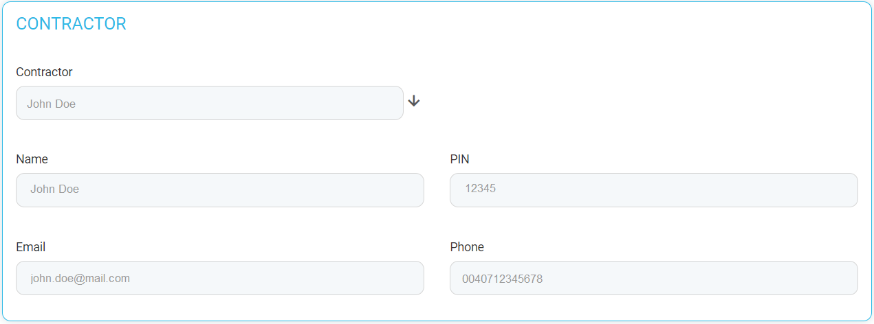 Name Description Name The full name of the contractor, concatenated. PIN Personal Identification Number. Email The email of the contractor. Phone The phone number of the contractor. Choose a Contractor from the drop-down to automatically fill in the fields with their details.