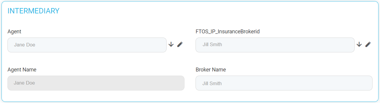 Name Description Agent Name The full name of the agent. Broker Name The full name of the broker. Only one of the Agent or Broker name fields can be filled. If you try to fill both, the following message is displayed: "A Master Policy can have either an Agent or a Broker".