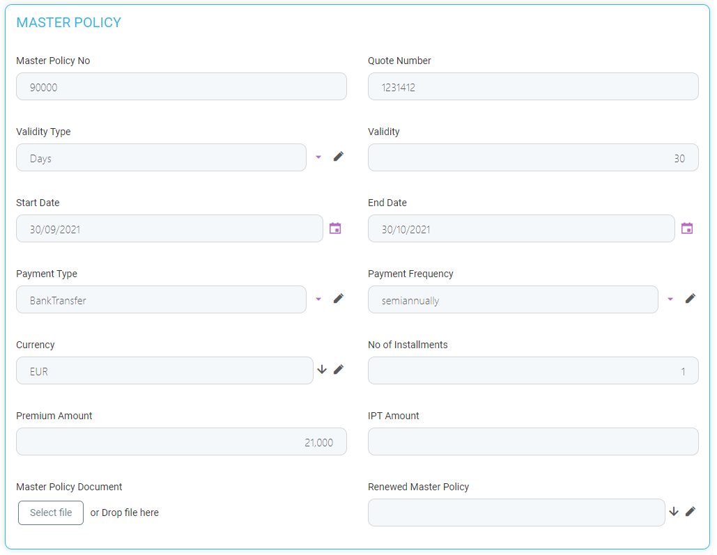 Name Description Master Policy No The unique number of the master policy. Quote Number The unique number of the quote. Validity Type Drop-down field with the following possible values: Days, Months, or Years. Validity The validity of the master policy expressed in the number of days, months, or years. Start Date The start date of the policy. End Date The end date of the policy. Payment Type Drop-down field, with the following possible values: Bank Transfer or PayU. Payment Frequency Drop-down field with the following possible values: annually, semiannually, quarterly, monthly. Currency The currency used for the policy. No of Installments The number of installments for the policy. Premium Amount The amount of the premium. IPT Amount The amount of the insurance premium tax. Master Policy Document The master policy file to be uploaded. Renewed Master Policy Option set to choose the master policy to be renewed. -
