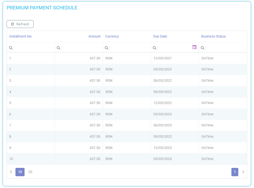 Name Description Installment No The number of the installment. Amount The premium amount for that record, for that installment. Due Date The due date for that installment. Business Status The status of the installment. -