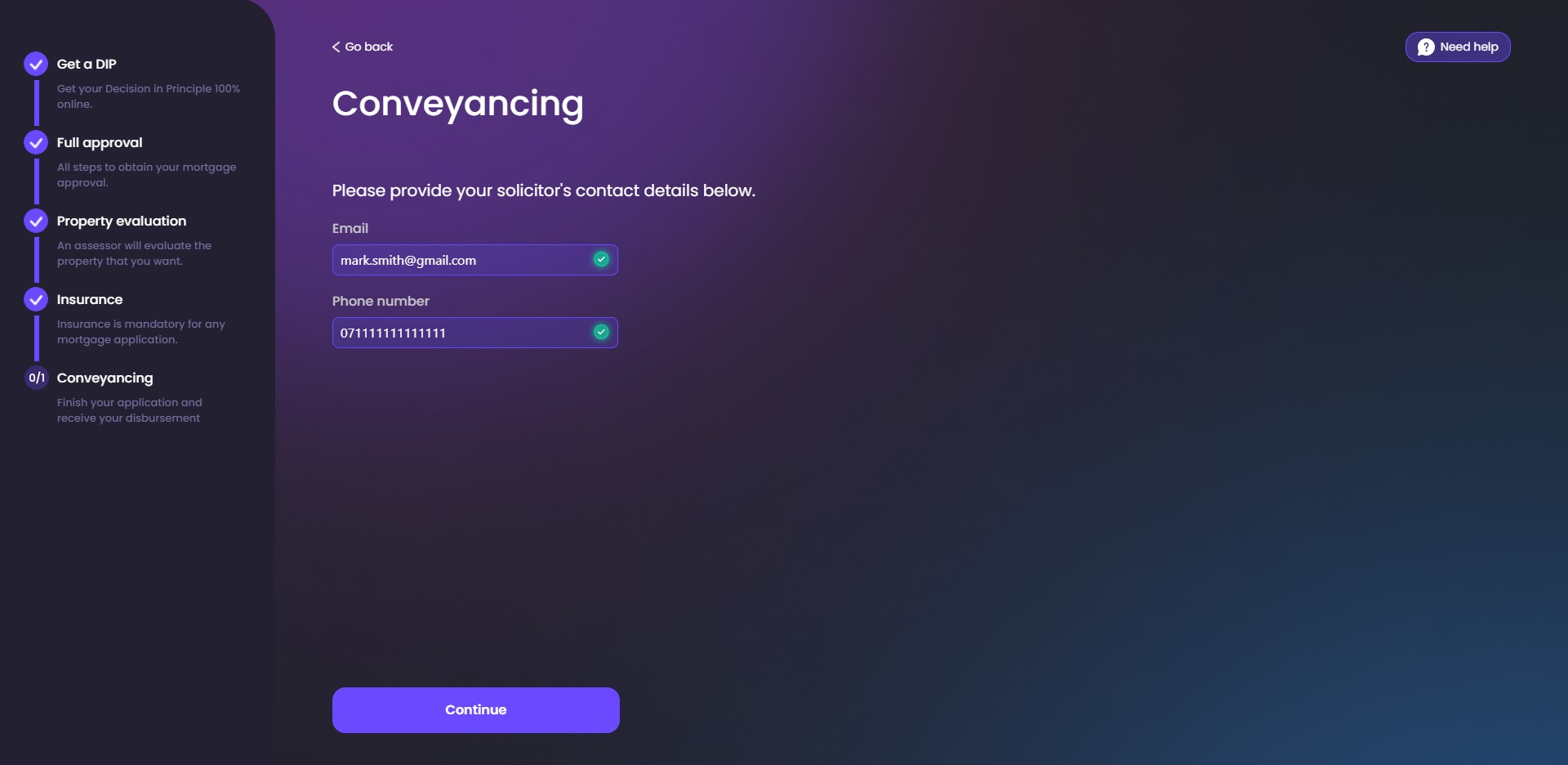 A confirmation message is displayed. Click Continue. The page reloads asking you to insert the solicitor's contact information. Insert the email address and the phone number of the solicitor that has the property deeds and the property title.