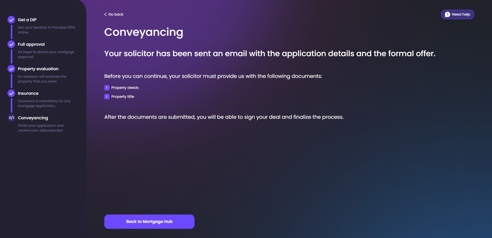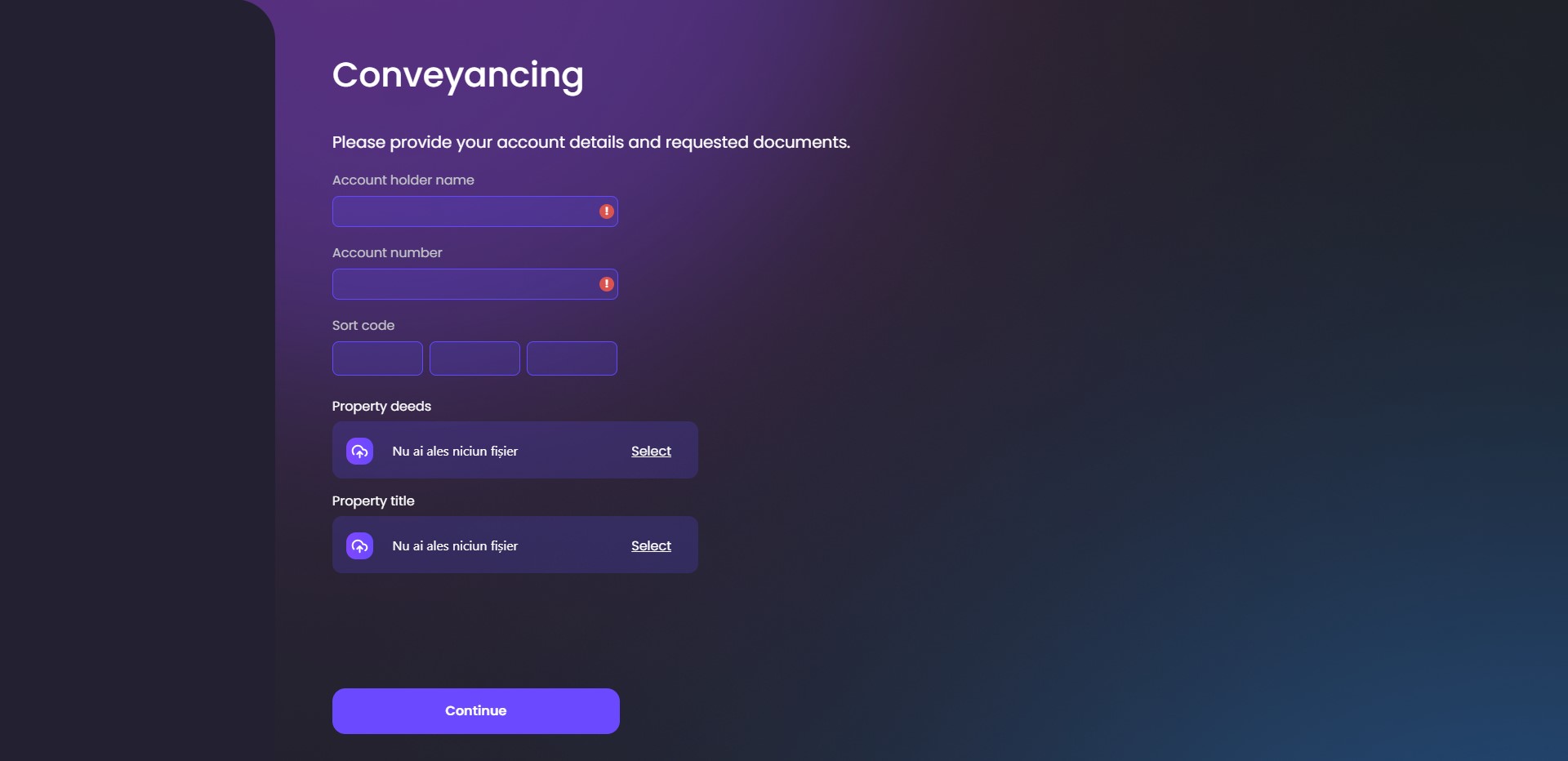 After inserting those details, click Continue. An email is sent to the solicitor's address with a link where to insert the documents.