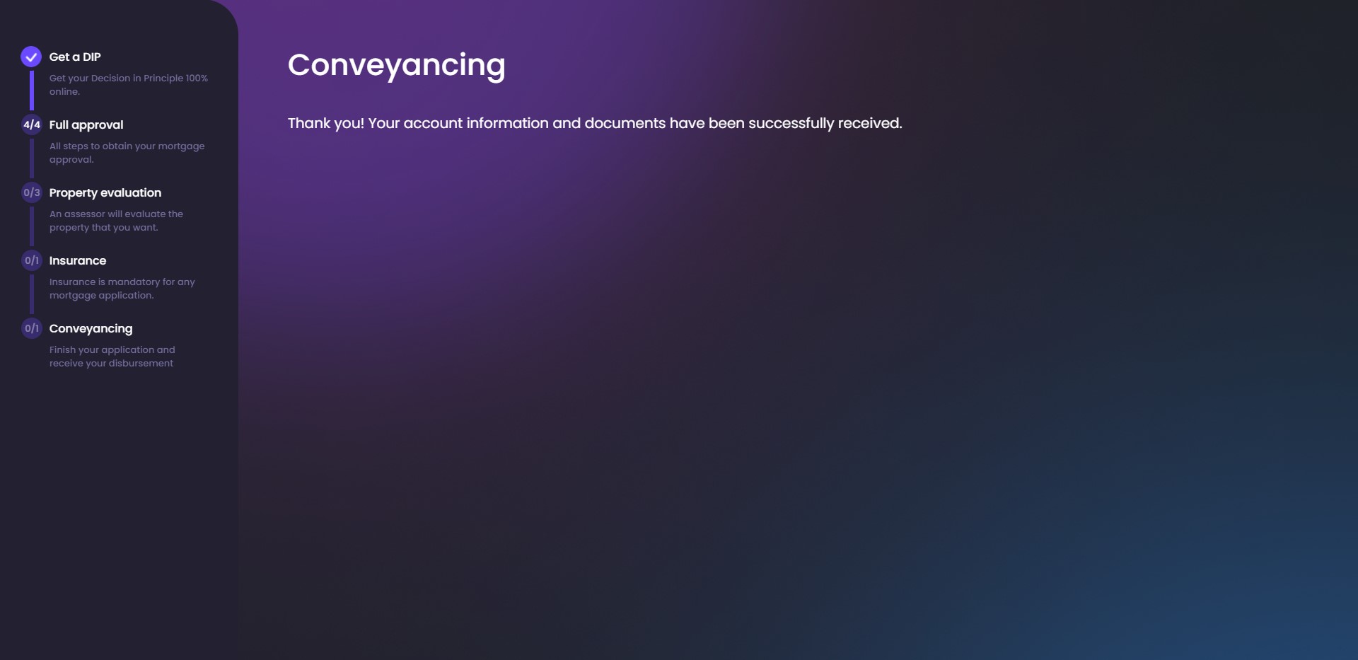 If the solicitor managed to upload the files and the underwriter to approve the documents uploaded (for details, see Changing the Business Status of a Customer), then this success screen is displayed.