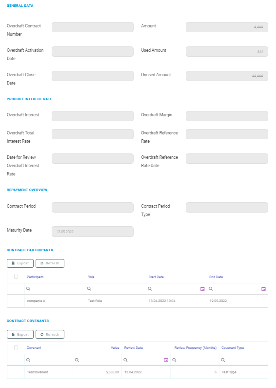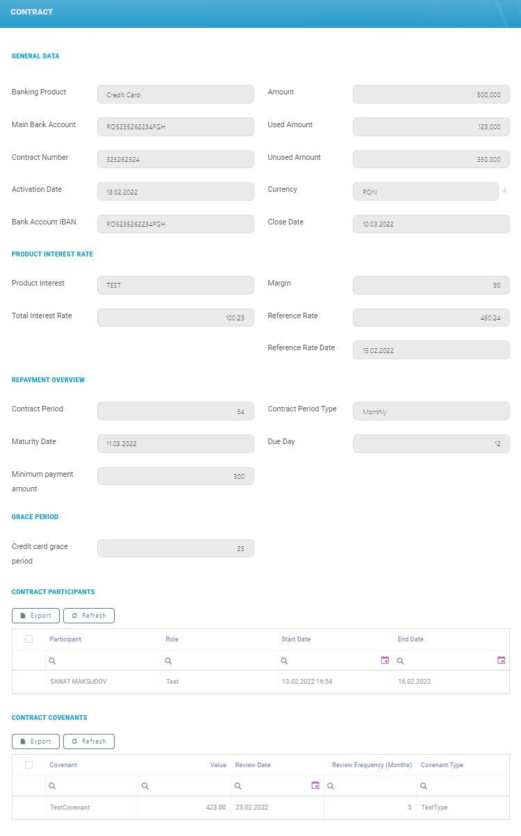 For the Contract Covenants section, the following data is displayed: