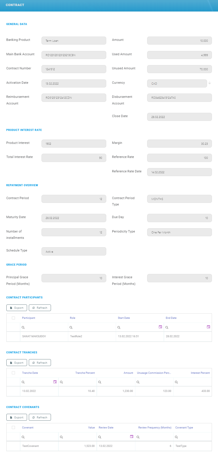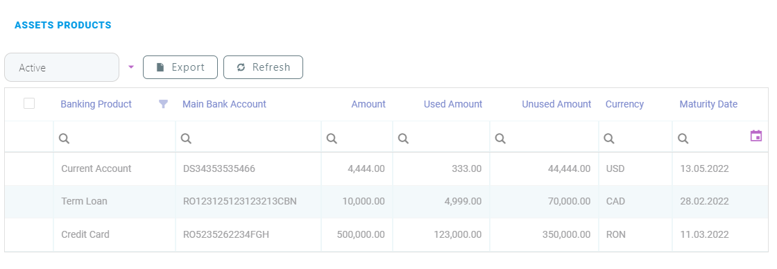 The Assets Products section contains the bellow contract types. By default, the active records are displayed but the inactive ones can also be viewed by changing the status filter to Inactive. To view additional information, double-click on a record. Depending on the banking product selected, certain tabs are displayed.