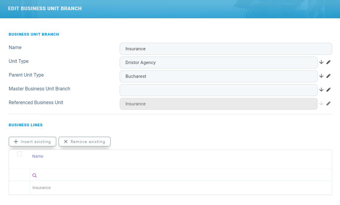 In the Business Lines section, click the Insert existing button. A pop-up listing all existing business lines is displayed. Double-click on the desired business line. The pop-up is closed and the business line is displayed in the Business Lines section.