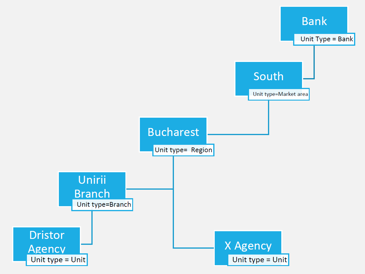 Unit types represent a way of organizing branches, departments, and sales areas into smaller groups based on the activity scope, the organizational chart position, or the geographical location. To define the units type: