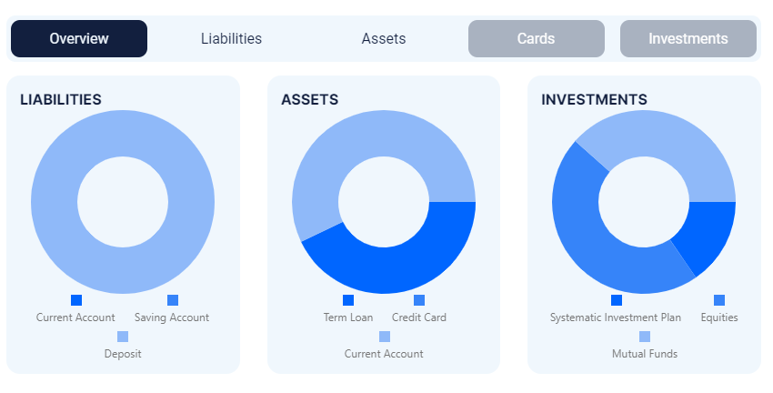 On the Overview tab, you can view a summary of the customer's liabilities, assets and investments displayed in pie charts for easier data visualization.