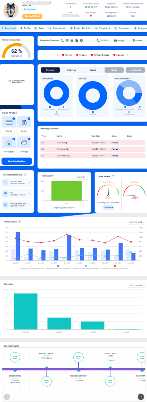You can see an overview on the customer's profile for quick access to general contact information, transaction history, and if the customer is flagged under any circumstance (a politically exposed person, embargo list, terrorist list, etc.) on the Dashboard tab.