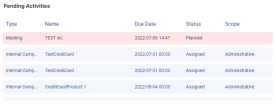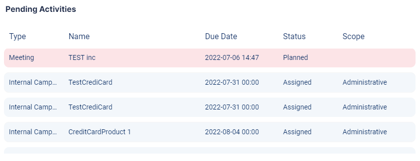 This widget helps relationship managers view the pending activities related to the customer's account and handle daily tasks.