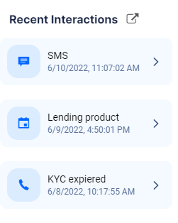 View the customer's three most recent interactions. Click on an icon to open the record to see additional information. This widget redirects to the Sales tab of the customer's profile.