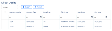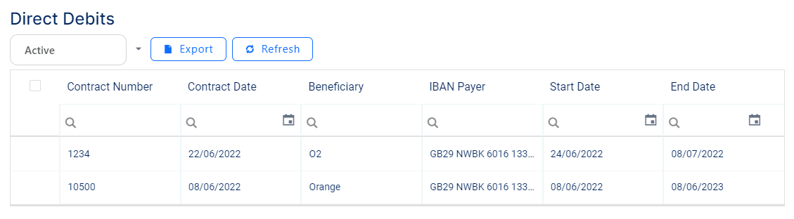 The Direct Debit tab displays the customer's direct debits set on their account. Direct debit are financial transactions that allow for certain funds to be withdrawn from the a person's account. For example, customer can set for some bills to be paid through direct payment.