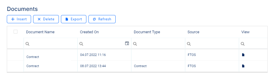 Documents linked to the customer's account are displayed in the Documents tab. To add a new document, click the Insert button and fill in the following fields: