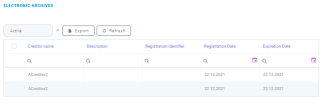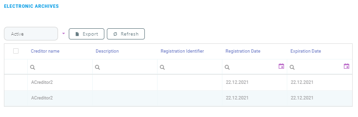 The Electronic Archives section displays information related to Electronic Archive of Real Movable Guarantees (EARMG) at the customer's account level. By default, the active records are displayed but the inactive ones can also be viewed. Select either Active or Inactive from the drop-down list to filter the records.