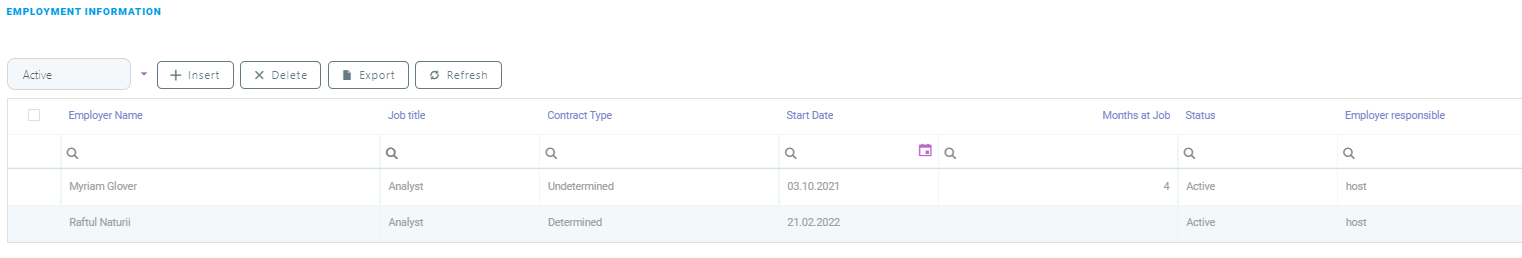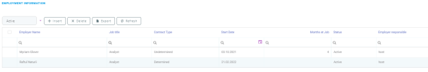 Information about the customer's work situation is listed in the Employment Information section. Here, details regarding the customer's current employer, contract type, job title, the total number of months at the job, and so on can be added or edited. By default the active jobs are displayed, but inactive ones can also be viewed.