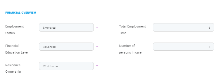 Information about the customer's main financial information such as employment status, residence ownership, employment time, and so on is stored in the Financial Overview section: