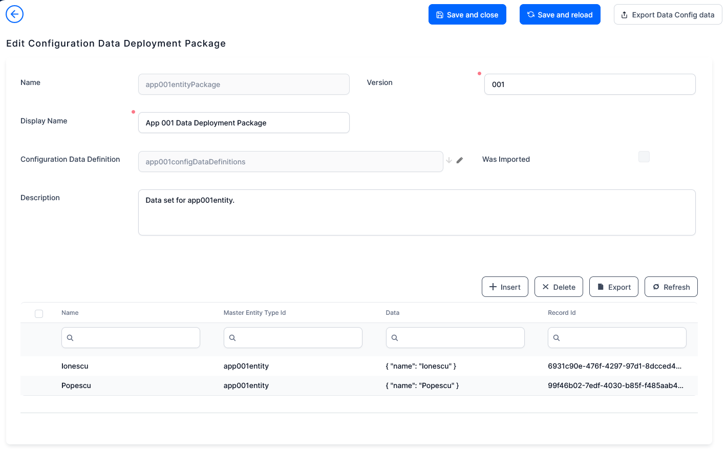 Field Description Name Name of the package. Version Name + "v"+Version + exportDate. Display Name Name displayed in the user interface. Configuration Data Definition The data definition for the export (for details, see Configuration Data Definitions). Once the configuration data package is saved, this field cannot be edited. Description Insert the details relevant to the package here. - Click Save and reload.