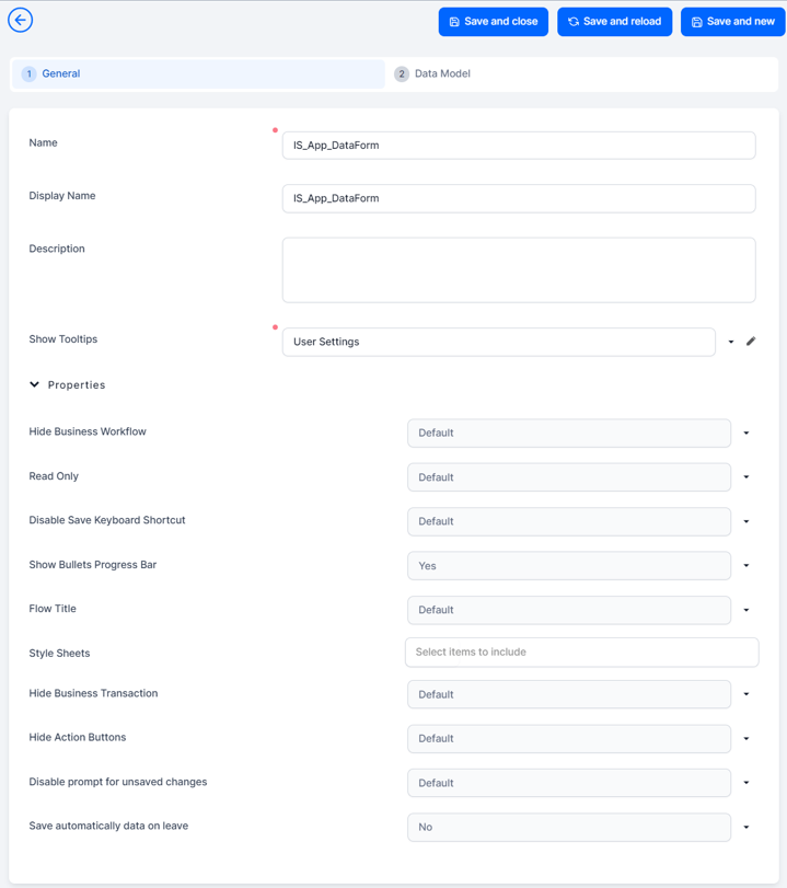 Style sheets Select the style sheet you wish to use. Multiple style sheets can be added. The order of how they are added is respected in the execution. For details, see Style Sheets. Hide Business Transaction Hides the Business Transactions button at the top right corner of the screen, which displays the business workflow transitions of the record. For more information about business workflows, see the Business Workflows Processor documentation. Hide Action Buttons Hides the Actions button at the top right corner of the screen, which allows you to open action groups or reports associated with the app data form (for details, see Defining Action Groups and Add Power BI Reports to Digital Journeys). Disable prompt for unsaved changes When navigating away from the form, for instance by clicking the Go Back button in the top left corner of the screen, if the form contains unsaved data, the user is not be prompted to save changes. Save automatically data on leave When navigating away from the data form, for instance by clicking the Go Back button in the top left corner of the screen, any unsaved data in the flow is automatically saved.