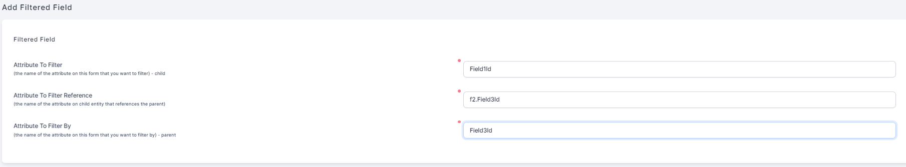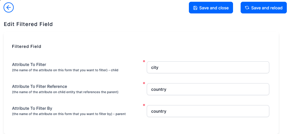 The Filtered Fields tab allows you to dynamically filter the options available in a lookup attribute field based on another field. For instance, you can limit the cities available in a drop-down based on a previously selected country. Thus, you can ensure data accuracy and streamline the user experience when the lookup entities you are referencing are also referencing each other.