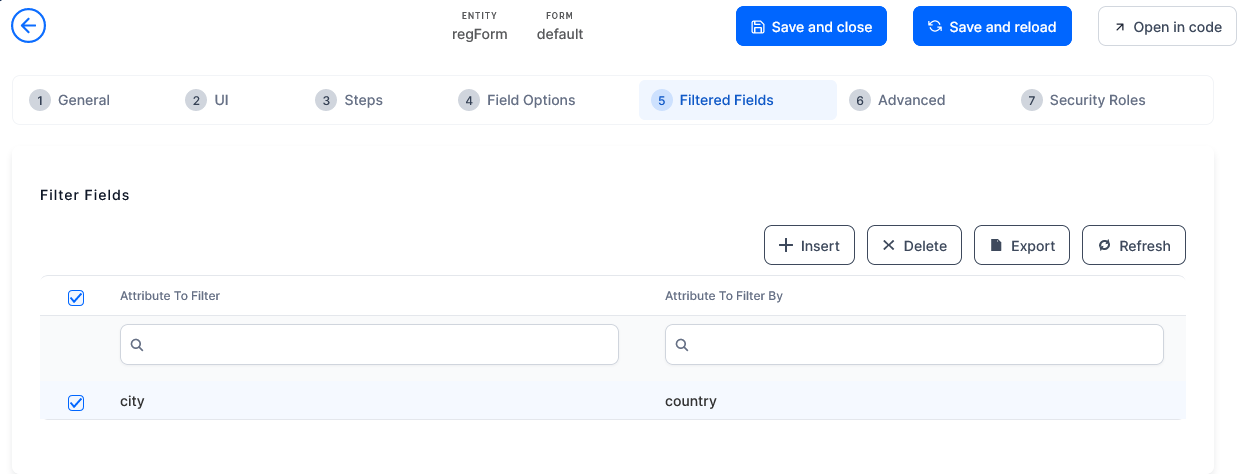At this point, you should have the following entities:Entity Attribute Type Description countries name text Name of the country cities name text Name of the city country lookup Reference to the countries entity regForm name text Name of the user city lookup References the cities entity country lookup References the countries entity. - When creating Data Forms, Form Driven Flows, or Servicing (App Data Forms), use the Filtered Fields tab to insert a filter for the city attribute based on its country.