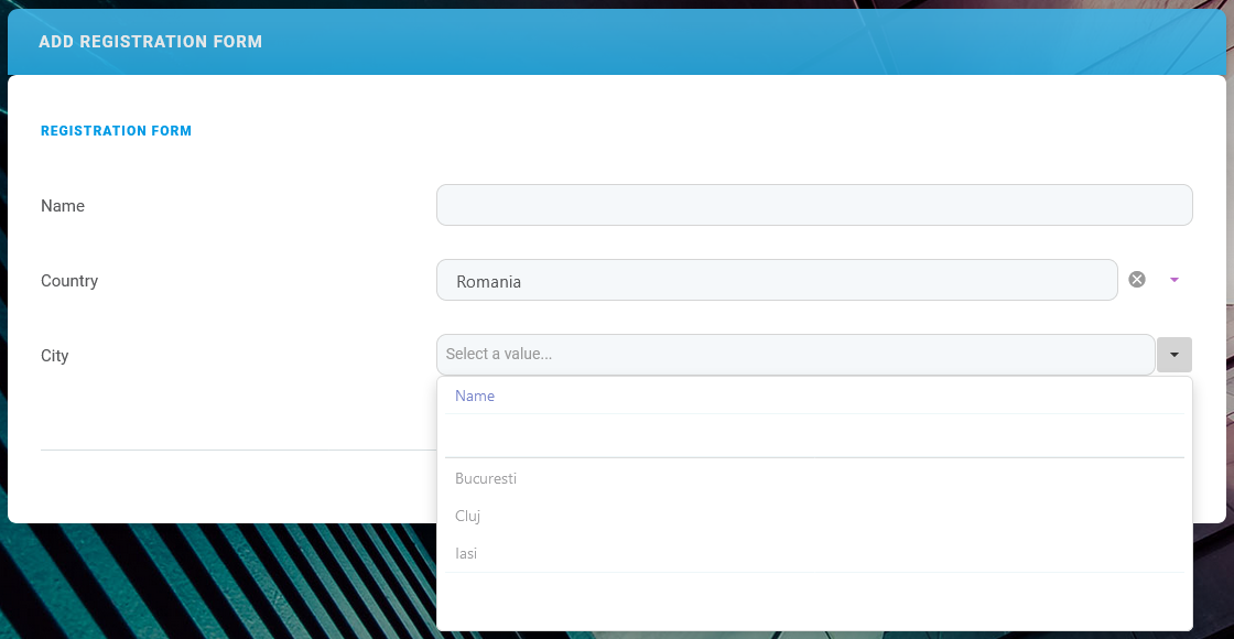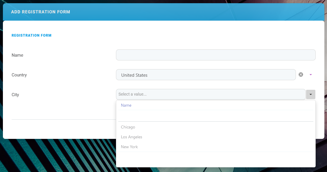 For instance, you may need to create a user registration form to collect each of your users' name, country, and city. The available cities and countries are stored in separate entities, and the city entity has a lookup to the country entity to reference which country the city belongs to. To create your registration form: