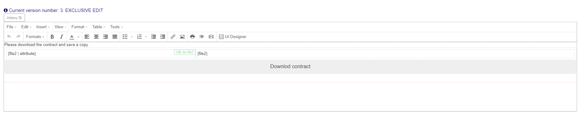- Optionally, if you have selected the Generate contract action, go to the UI tab and add the button for this action and the file attribute created in the Data Model of the entity. For more information, see Digital Documents Processor.