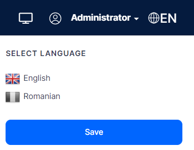 By default, the page lists the standard system languages: English (EN) and Romanian (RO). To use any of them, on the right-side of the navigation bar, next to your name, click the language code icon, and select the language that you want to use.