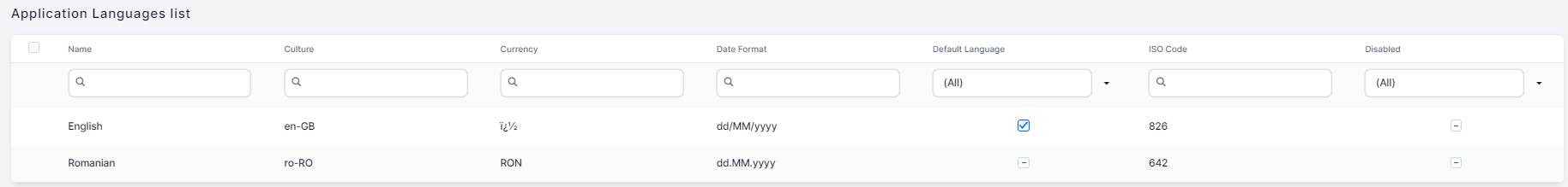 | Culture | The .NET language culture. Make sure that you enter one from the available .NET cultures. The field is mandatory. By default, two cultures are available: en-GB and ro-RO. | ||||||||||||||||