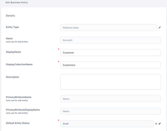 On entity creation, the entity's primary key attribute, that is an unique identifier for each entity instance, is automatically generated by the system following this naming convention:'entityname + Id'. The primary key is displayed in the entity's list of attributes and has the attribute type PK.Display Name The entity name that will be displayed on views and forms. It is also the label to be localized in different languages. The Display Name should appear as a noun in singular format (e.g. “Customer”, or “Physical Address”). DisplayCollectionName - Provide a Collection Name if you want to display the entity on the left-side menu or pin it on the application homepage.