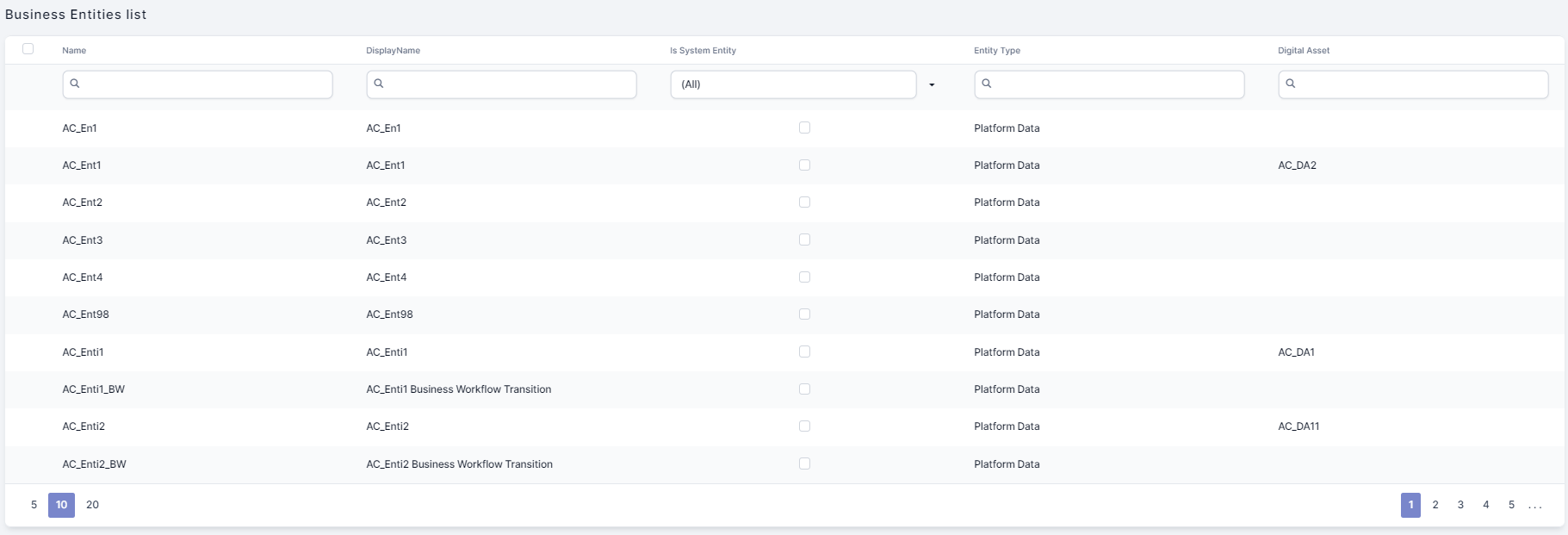 You can filter entities by all the search fields displayed in grid, including Name and DisplayName. You can apply multiple filtering criteria at the same time.