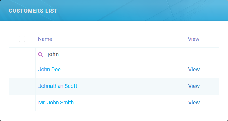 For example, a portal user does a partial search (“john”) by Name on the Customers list. The search returns all names that contain “john”.