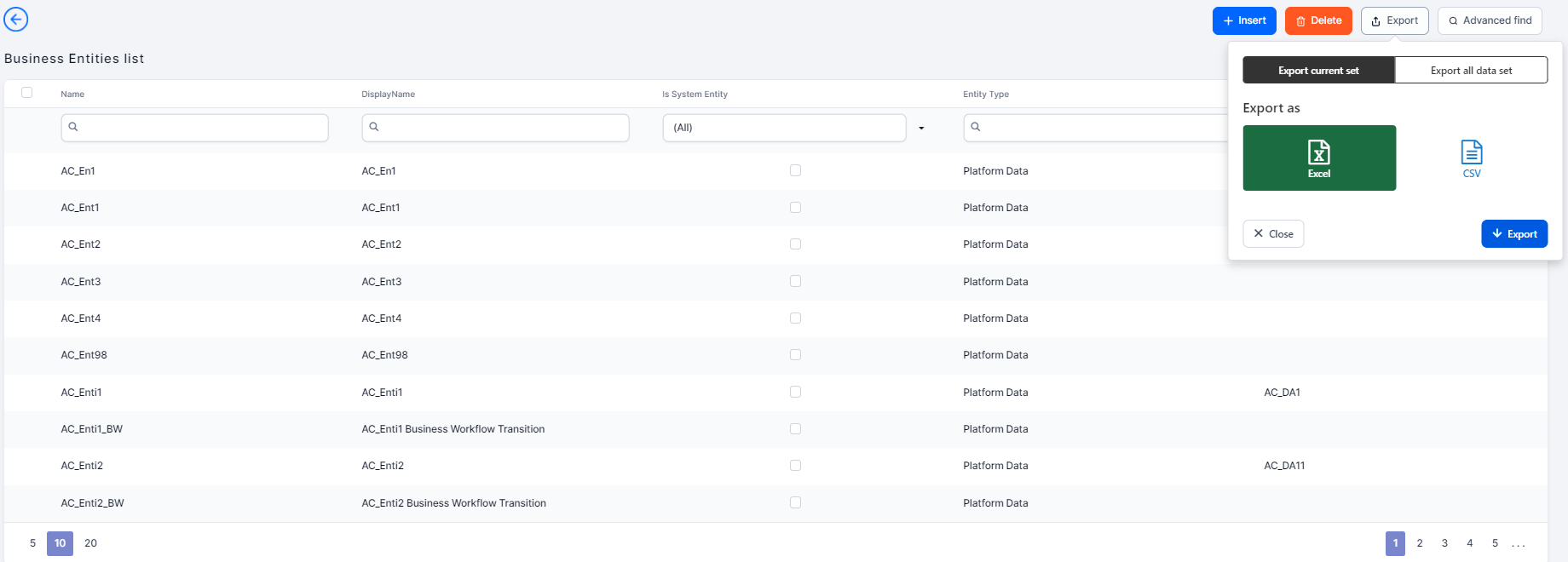 FintechOS Studio allows you to export the records from any entity (including entity and attribute). To do so, at the upper-right corner of the page, click Export and select one of the export options: